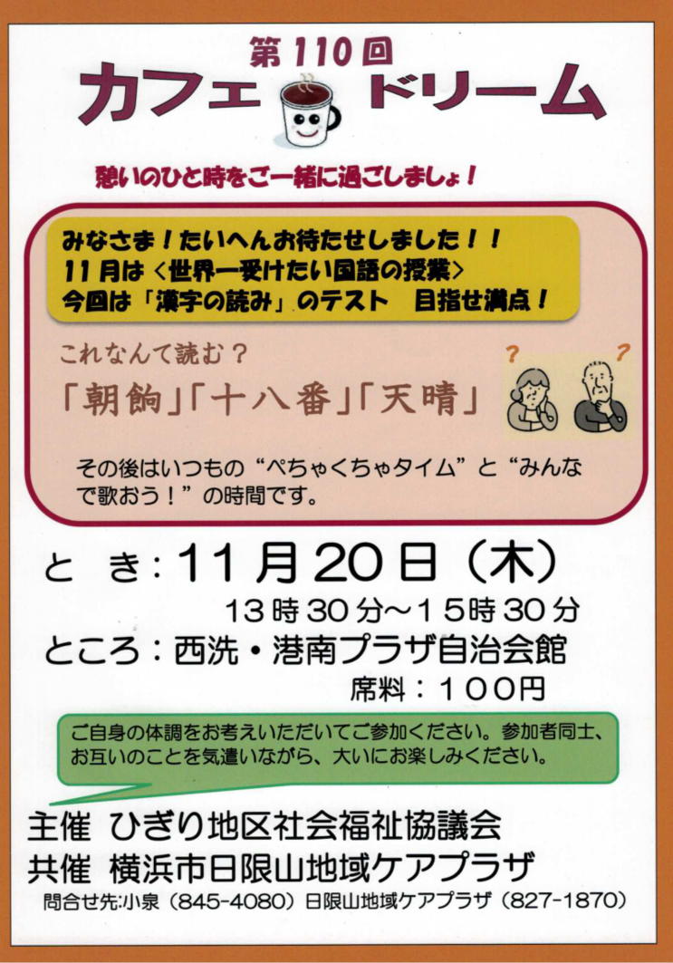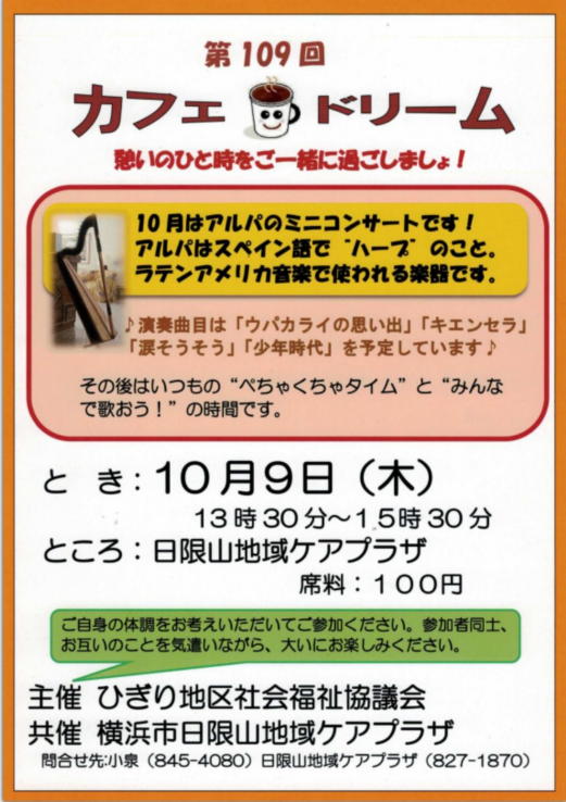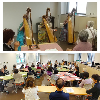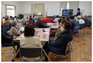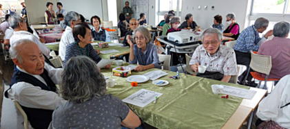 | ■カフェ・ドリームの実施の様子 月一回開催のカフェ・ドリーム。ビンゴゲーム、川柳クイズ、国語の授業などの頭の体操、ぺちゃくちゃタイムでのコーヒーとお菓子をいただきながらの来場者同士のおしゃべり、懐かしい曲の歌声、ときには地域内の奏者の演奏を聴くなど、お楽しみのひとときを過ごしていただきます。 |