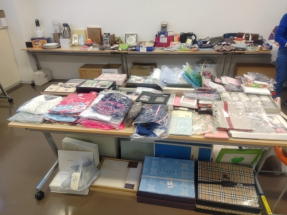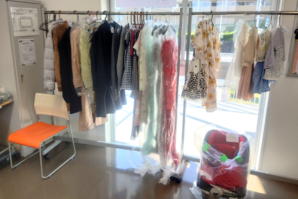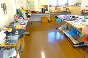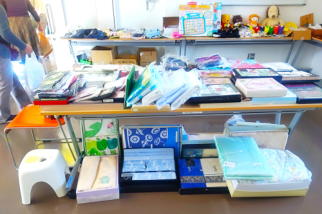 集まったバザー品をケアプラザ2階ケアルームに並べて、準備完了