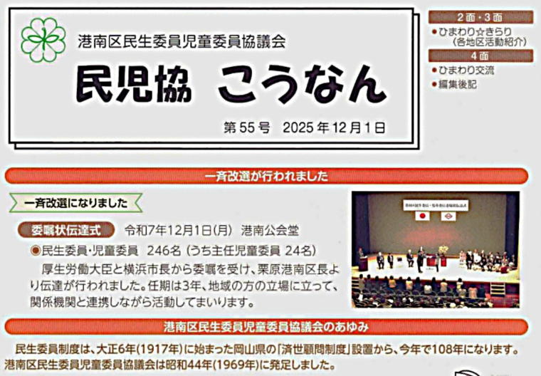 「民児協 こうなん」誌から、委嘱状伝達式・ひぎり地区民児協活動紹介の記事