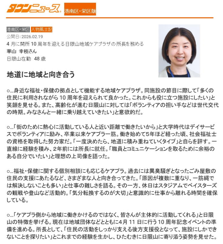 タウンニュースに日限山地域ケアプラザ所長の記事が掲載(2026.2.19)