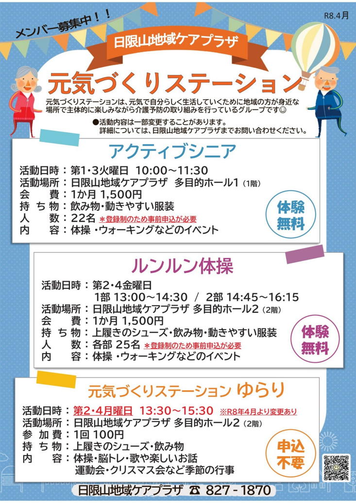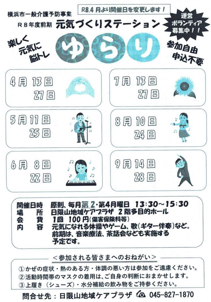 2026年上期の元気づくりステーション「ゆらり」の開催日が決定されました。