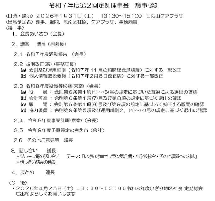 令和6年度 ひぎり地区社協 第2回理事会 のお知らせ